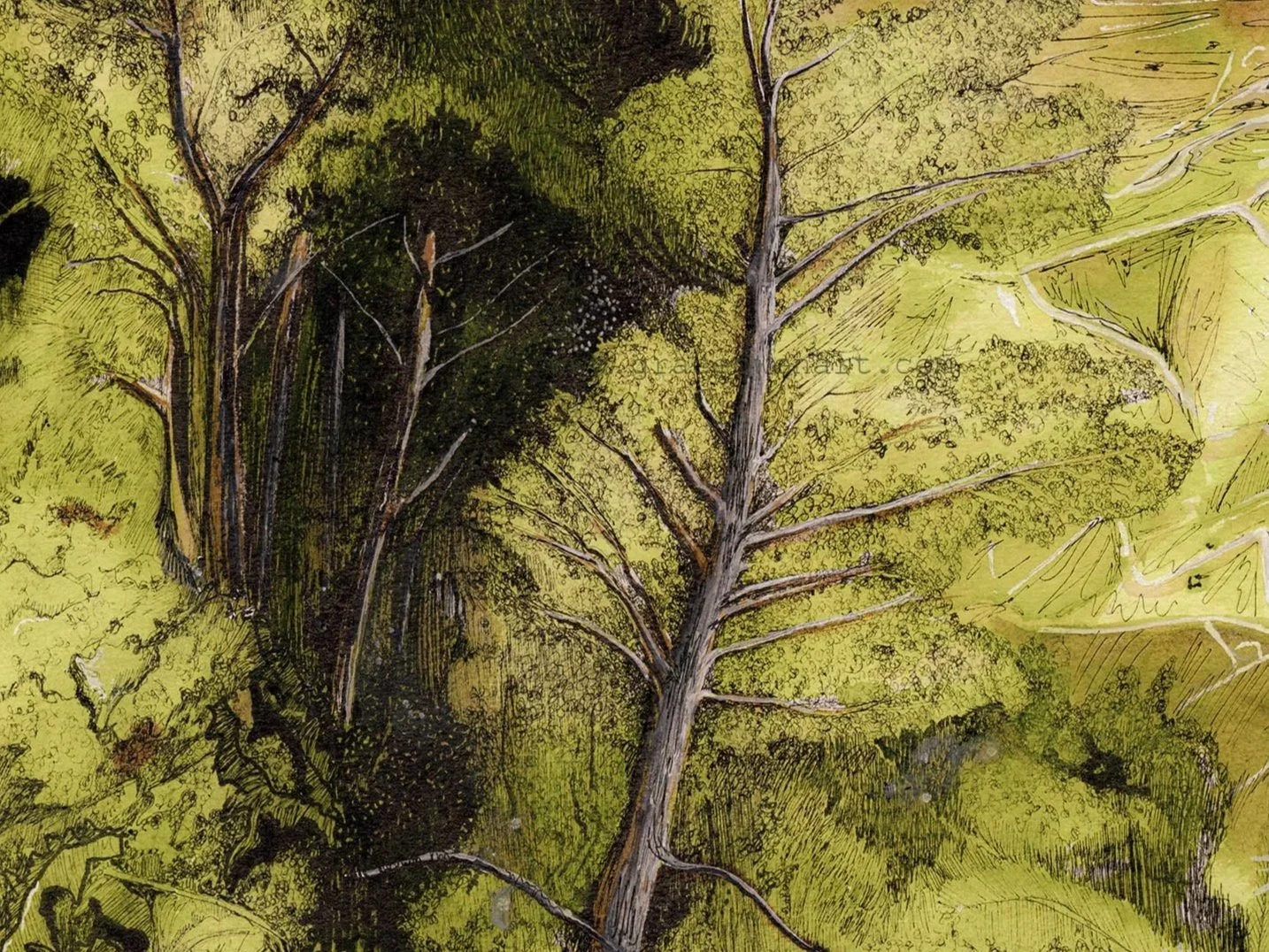 Drawings and Paintings inspired by the landscape of the island of Sicily. Castelmola Trees in Watercolour Mount Etna drawn with red biro A black and white drawing in ink of a farm house in Castelmola, Sicily Castelmola Coast